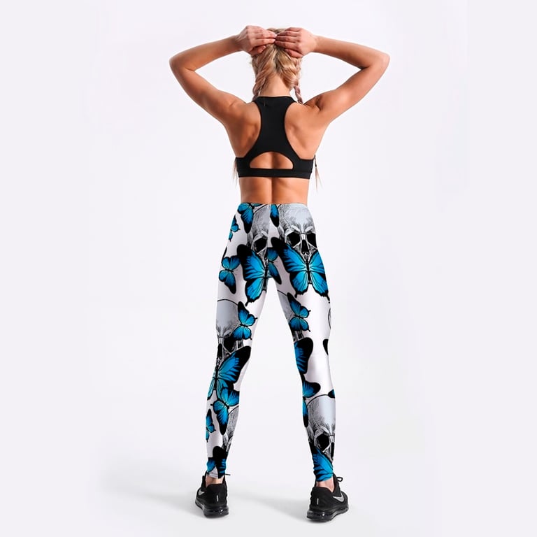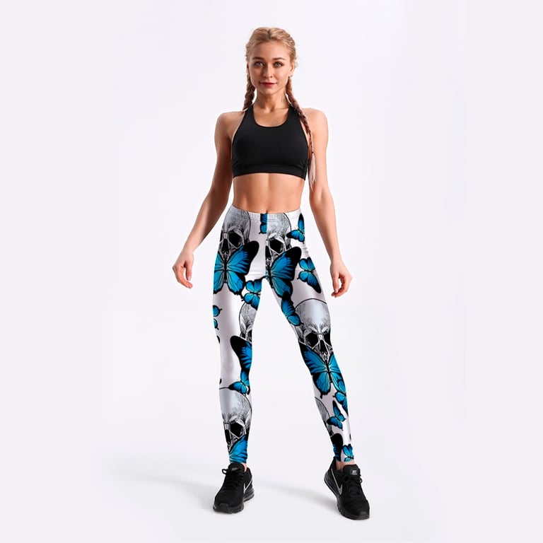 The leggings feature a print of blue butterflies.