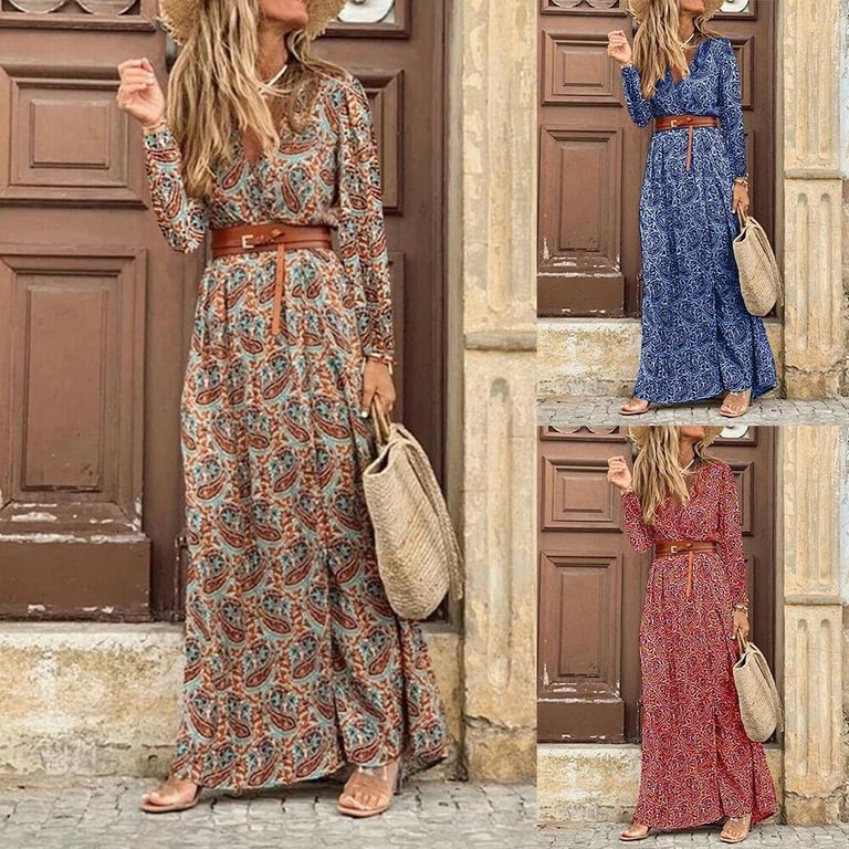 Women's spring boho dress with long sleeves and long sleeves.