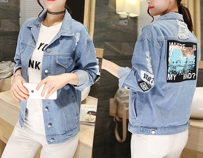 Women's Spring Denim Jacket in Distressed Design with Print