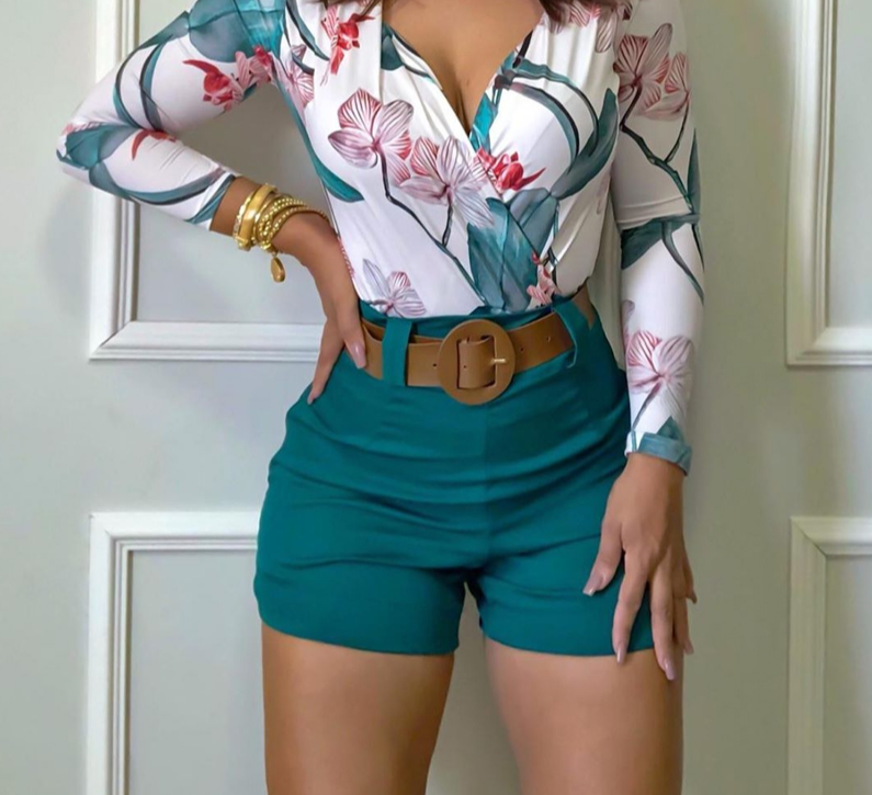 Tags: women's spring set, women's summer set, women's blouse with neckline, women's blouse, women's blouse with long sleeves, women's shorts, women's shorts, high-waisted shorts, women's fashion, women's clothing, women's summer clothing, women, fashion, style