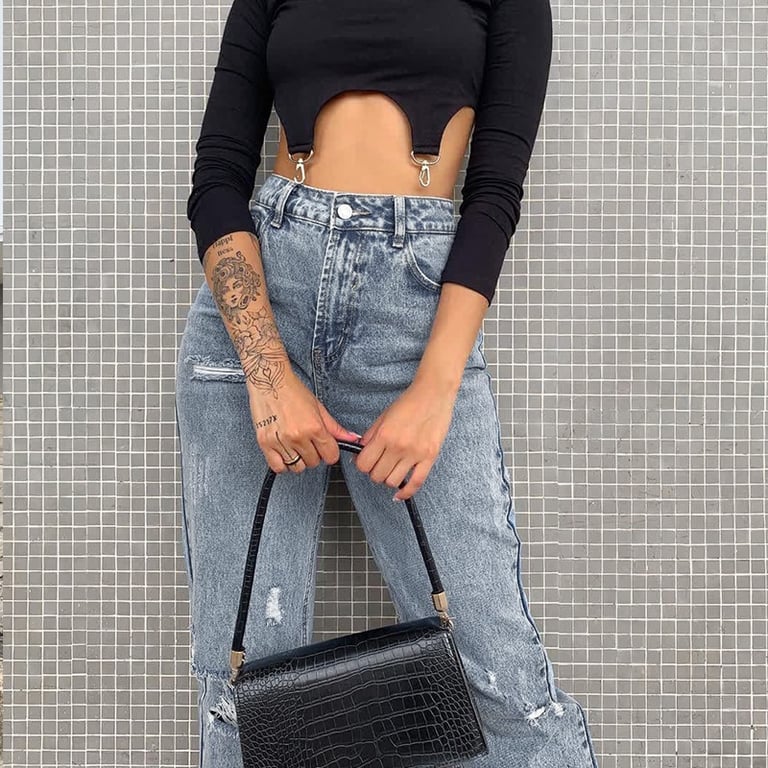 • Full-length legs adorned with rips on the thighs and a comfortable high waist with a classic zip and button fastening.