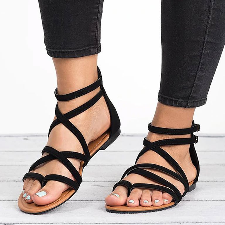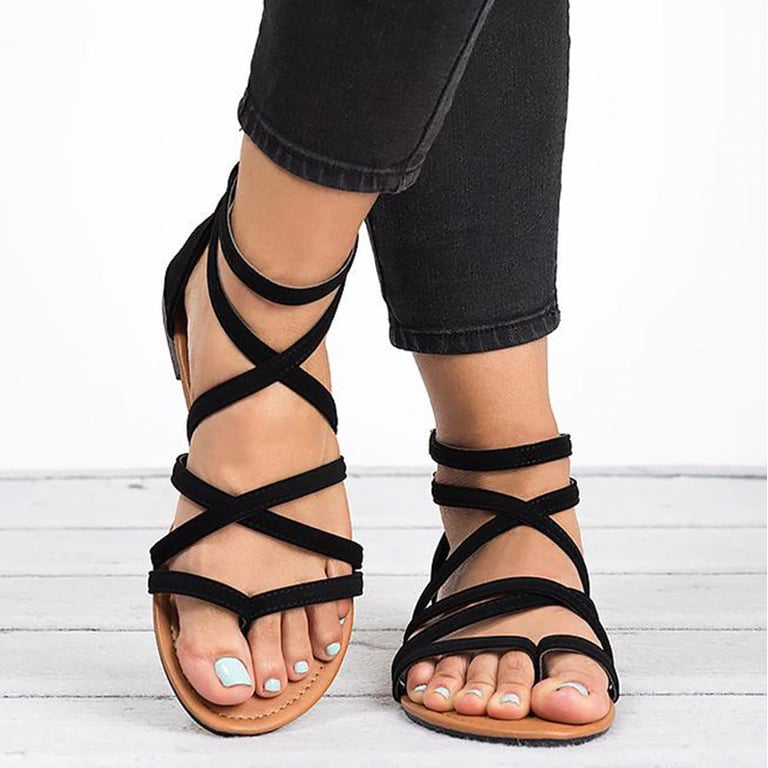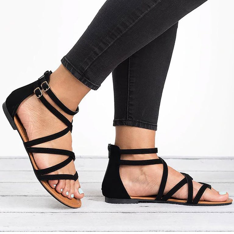 Women's sandals with straps and an open toe. Flat sole. Leather look. Available in multiple colour options.