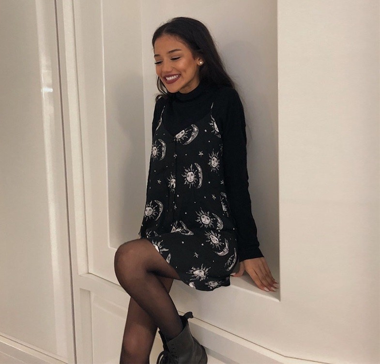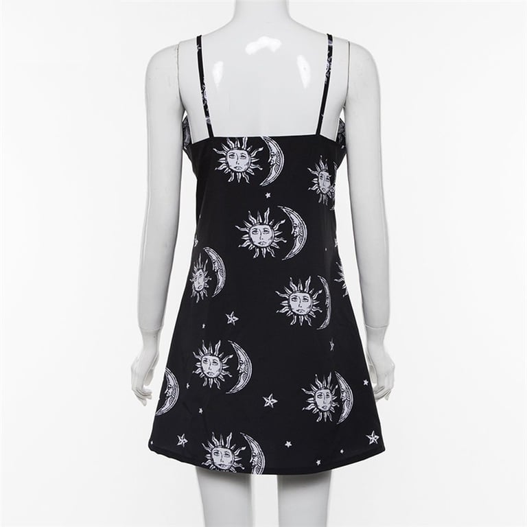 Women's dress with a print of the sun, moon, and stars.