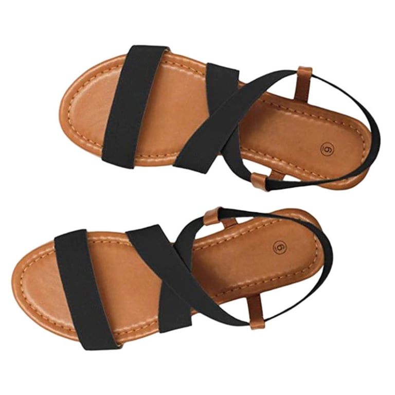 Women's sandals with wide elastic straps. The sandals have an open toe and heel and a flat sole without a heel. Available in multiple colour options.