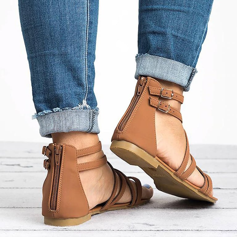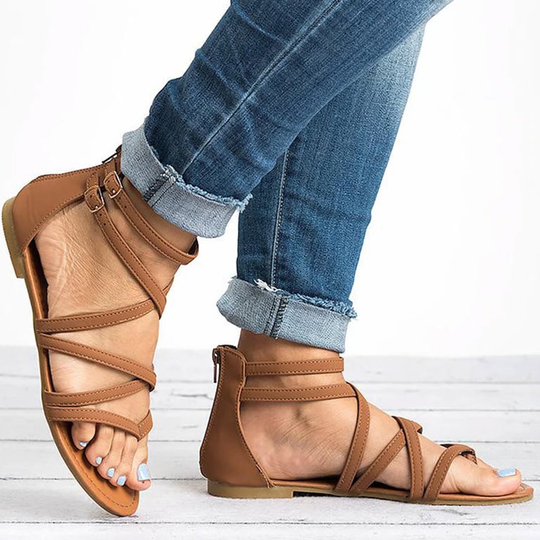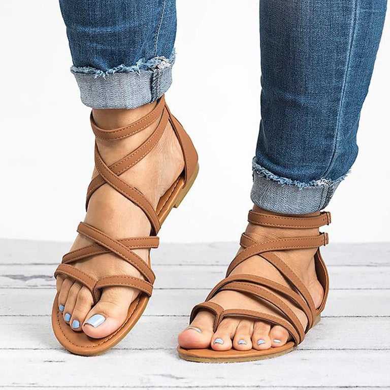 Women's sandals with straps and an open toe. Flat sole. Leather look. Available in multiple colour options.