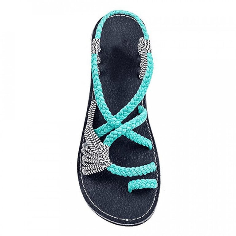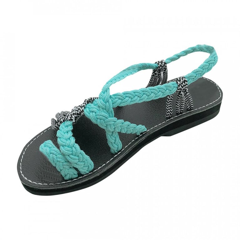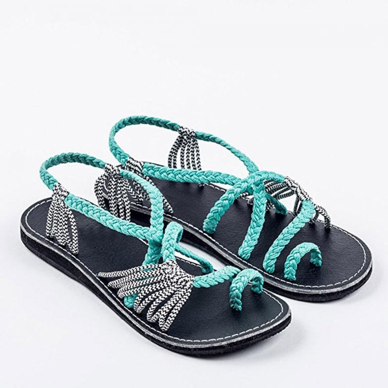 Women's sandals with a flat rubber sole and woven nylon straps with knots. Available in several colour options.