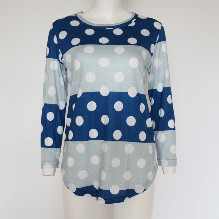 The t-shirt is striped with white polka dots.