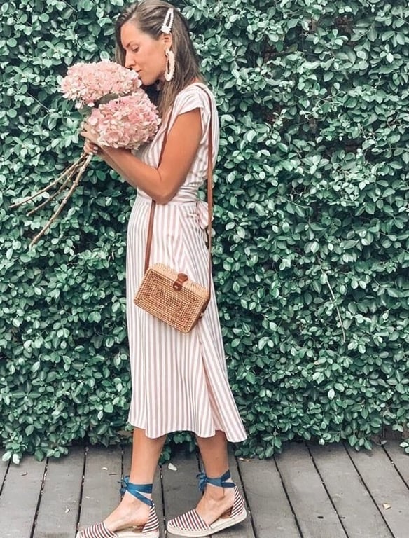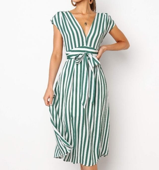 Always elegant stripes! Simple dress with a V-neck and a bow.