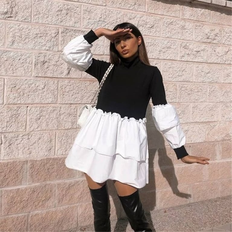 • Tags: Women's dress, stylish dress, short dress, long sleeve dress, turtleneck dress, dress with ruffles