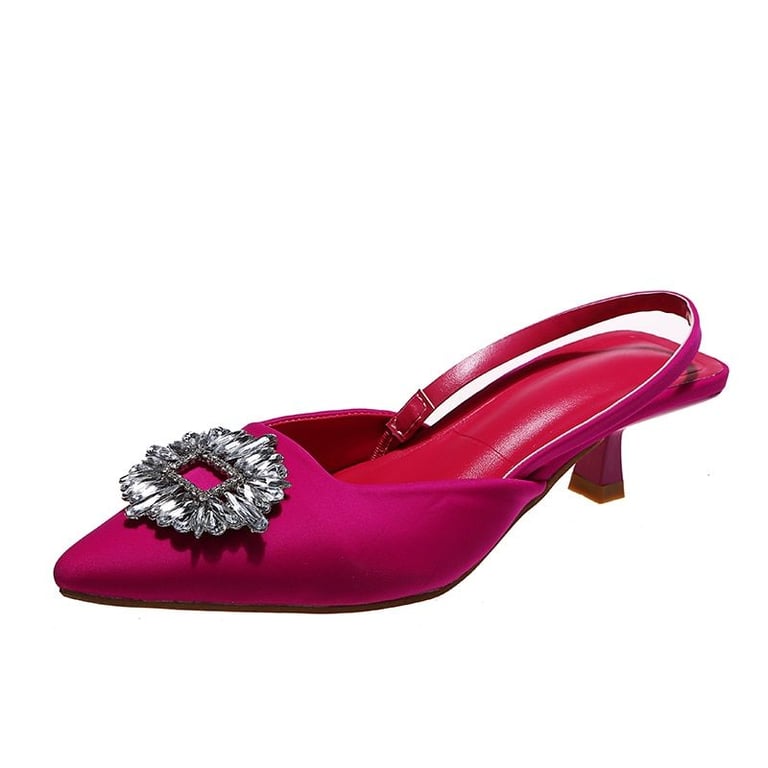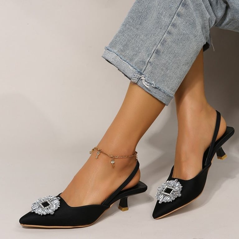 Women's pointed low-heeled shoes with a silver embellishment.