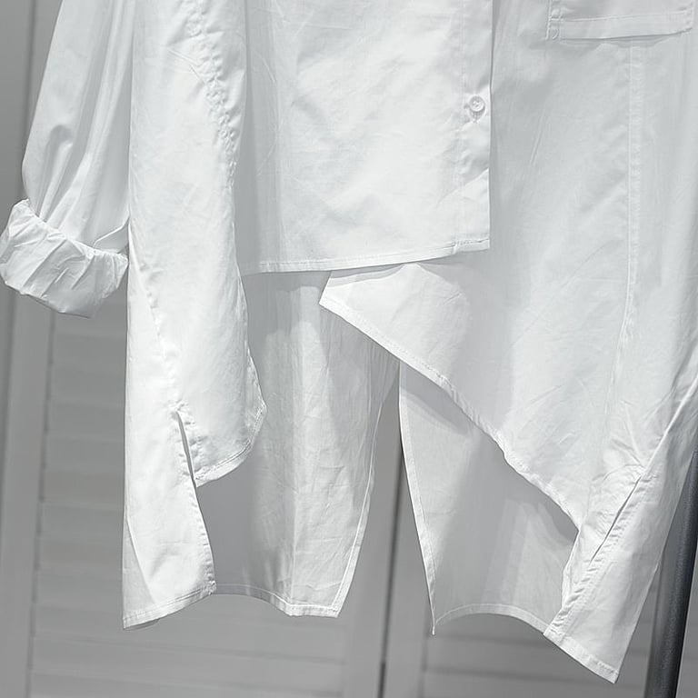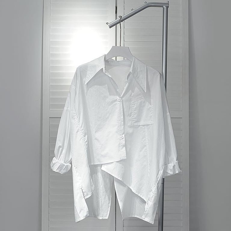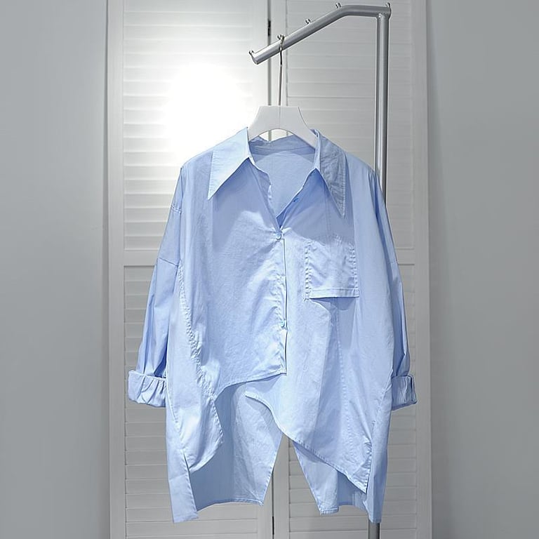 • Stylish women's oversized button-up shirt with an asymmetrical cut.
