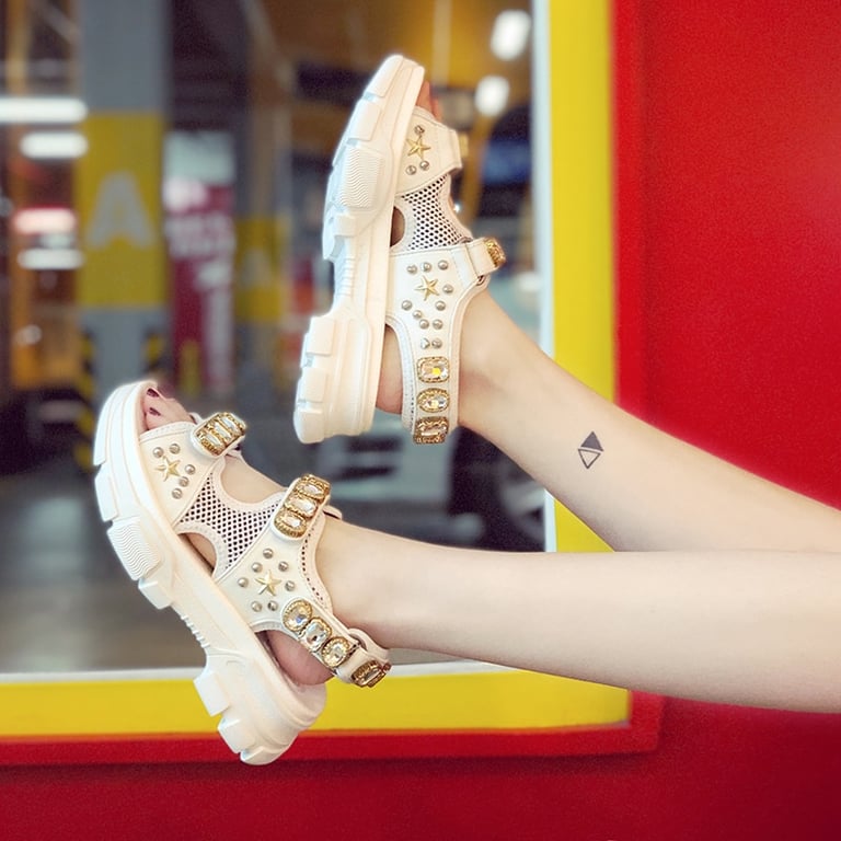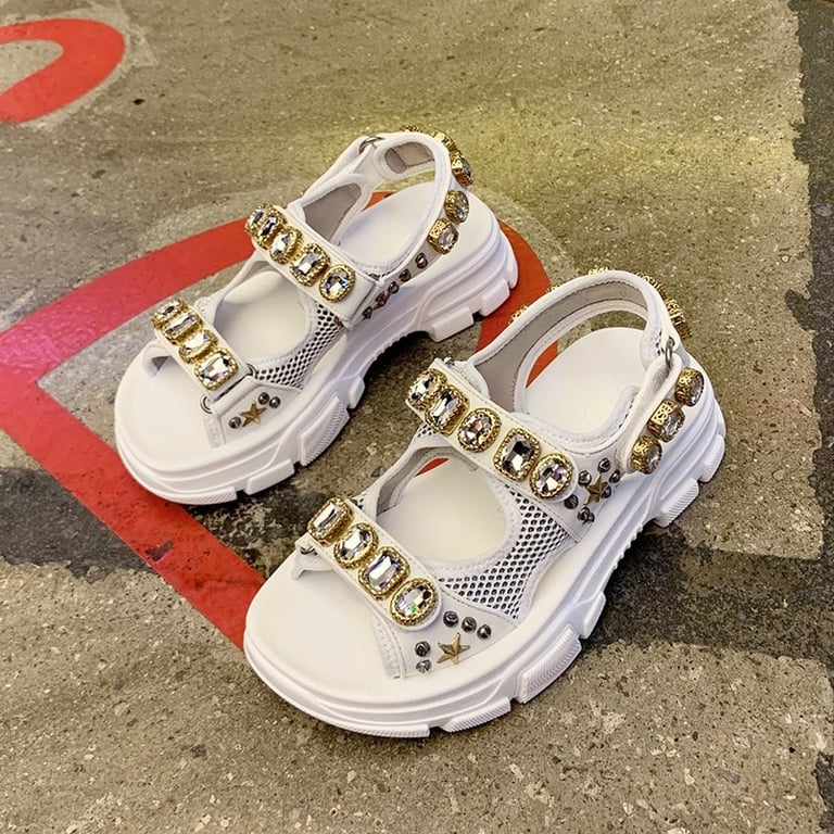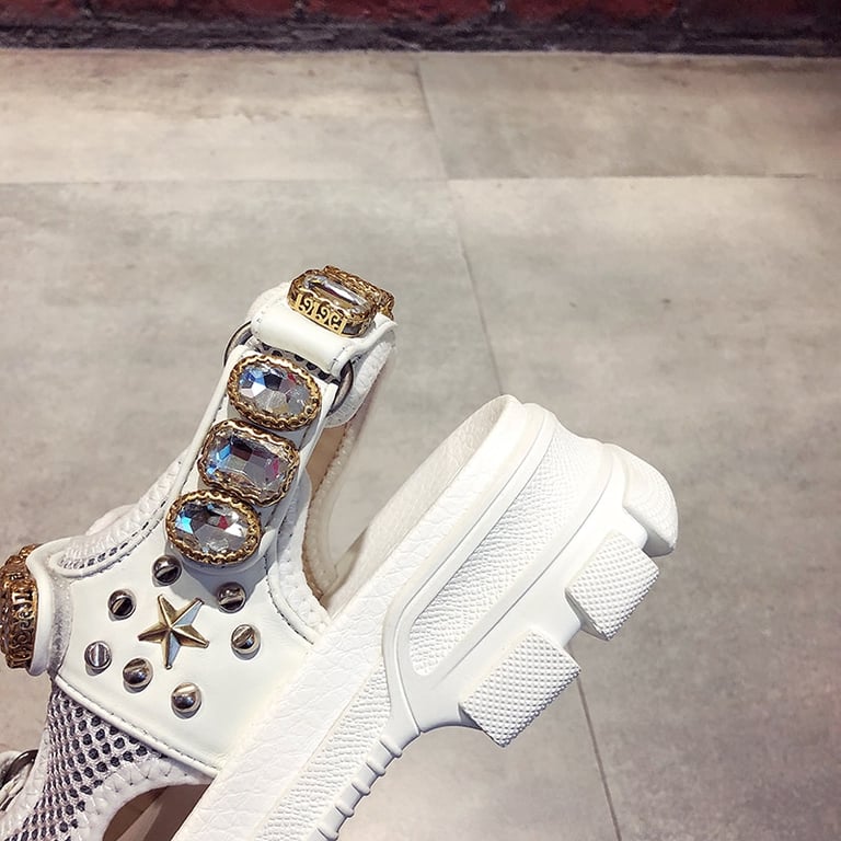 If you love sandals but also want a unique piece, these shoes are made just for you. These interesting white sandals feature a raised sole and are adorned with beautiful stones. They are also breathable, non-slip, and very comfortable.