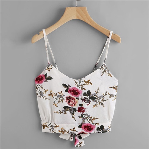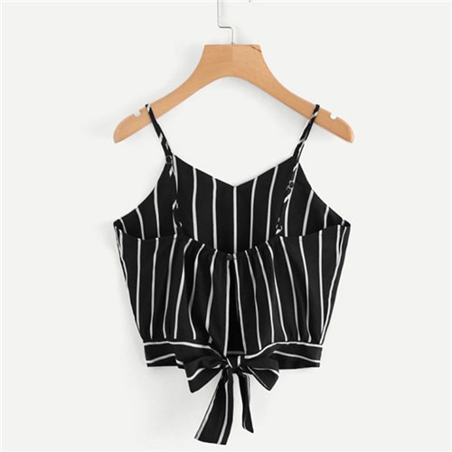 The crop top features thin straps and is tied at the back with a small cute bow.