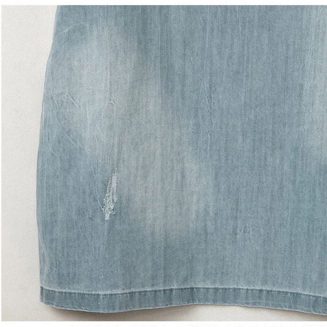 These denim dresses are a great addition to your wardrobe. The dress features short sleeves and a round neckline, fastening with a zip at the back. The upper part of the dress is adorned with small faux pearls.
