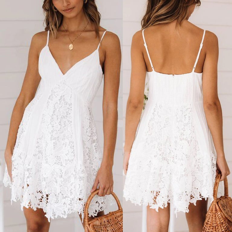 Women's summer dress with thin straps, featuring a V-neckline and an A-line layered skirt. The dress comes in a beautiful white colour and is made of lace.