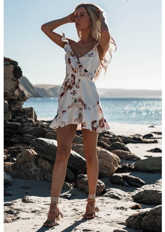Short summer dress with spaghetti straps and decorative ruffles.