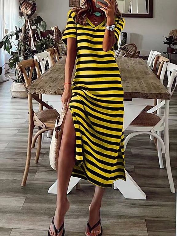 Women's summer mini dress with short sleeves and striped pattern.