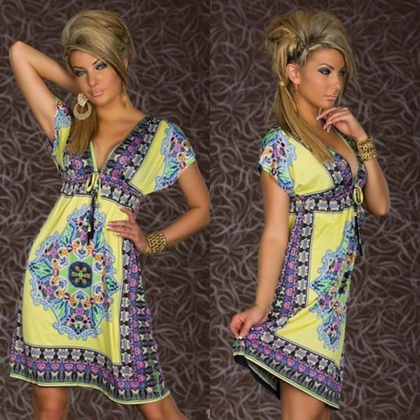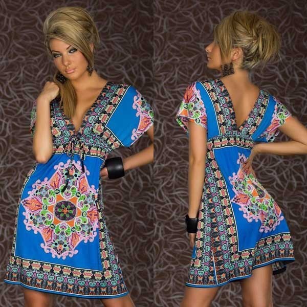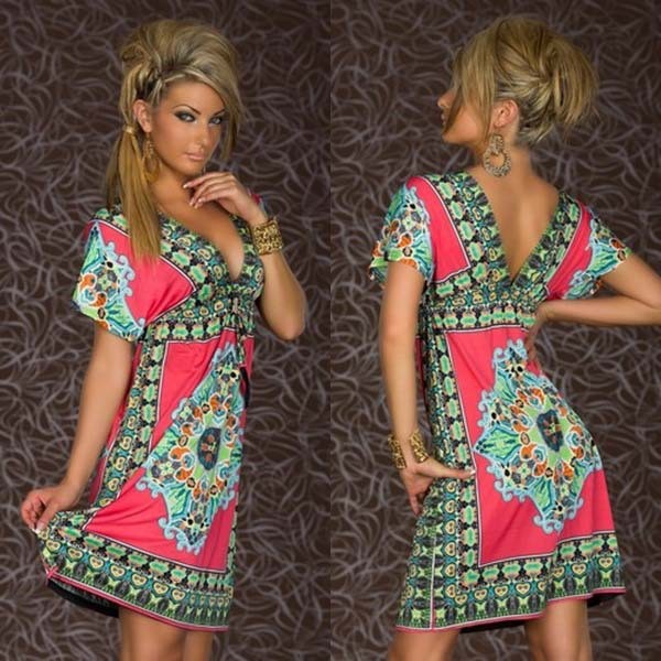 Beautiful women's summer dress styled in a retro design. The dress is adorned with patterns, has short sleeves and a V-neck, and is also cut in a V-shape at the back.
