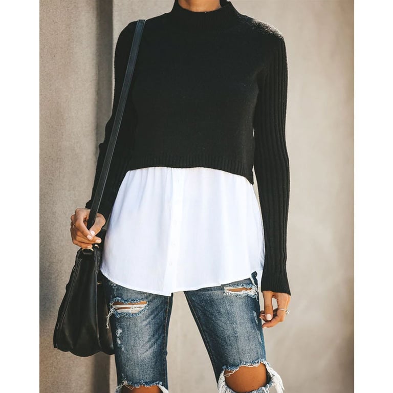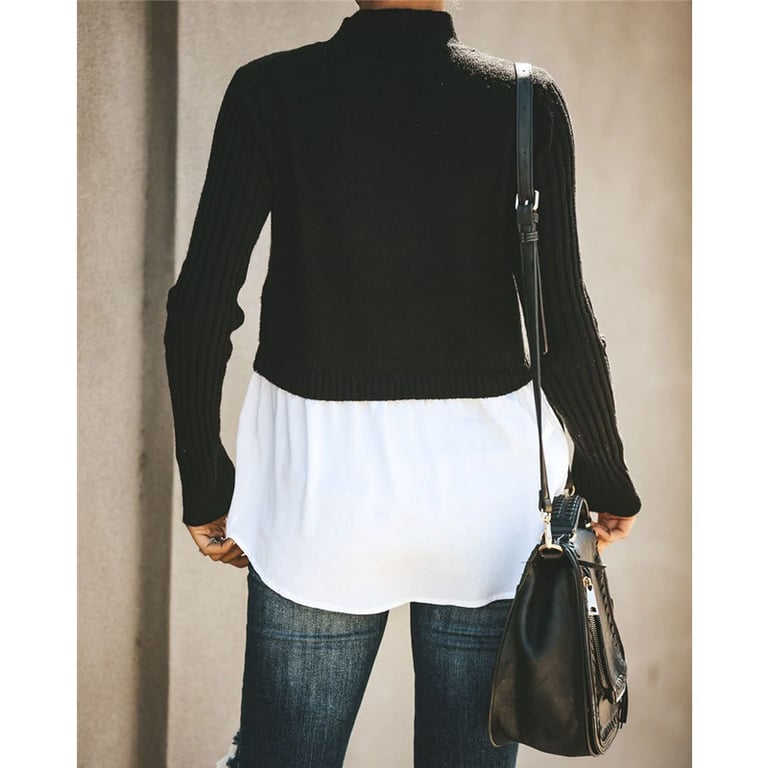 Women's sweater with a turtleneck. The sweater features an integrated shirt at the bottom and long sleeves. Available in multiple colour options.