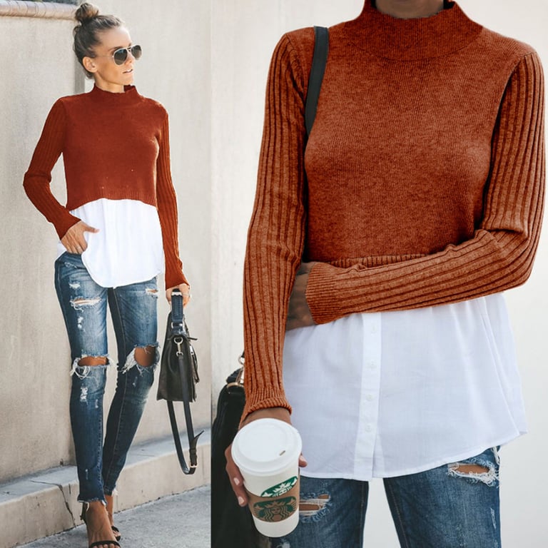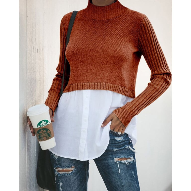 Women's sweater with a turtleneck. The sweater has an integrated shirt at the bottom and long sleeves. Available in multiple colour options.