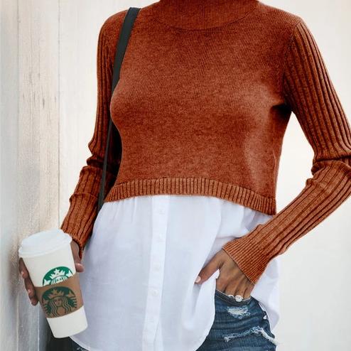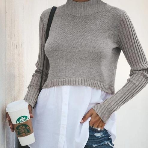 This cleverly elegant piece combines a lightweight long-sleeve jumper with a button-up shirt. The stand-up collar adds an interesting detail to the whole outfit.