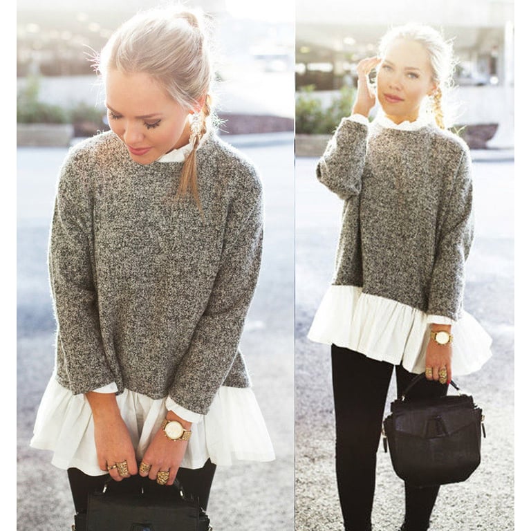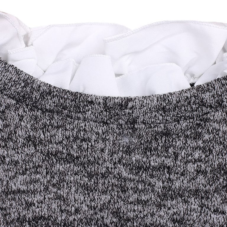 Women's stylish sweater in grey with a round neckline and long sleeves. The sweater has a loose fit and features a white shirt with a collar and ruffles sewn in.