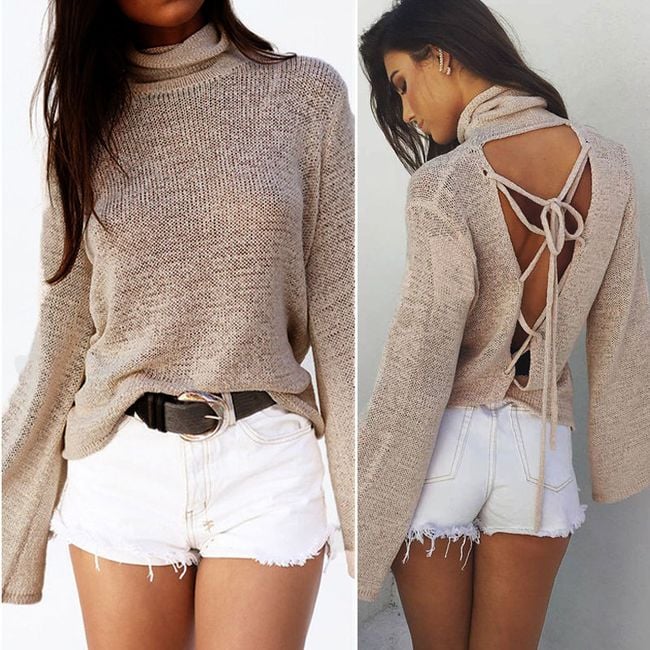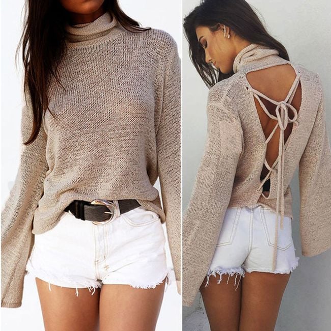 An extraordinary sweater with an original back neckline is available in several sizes.