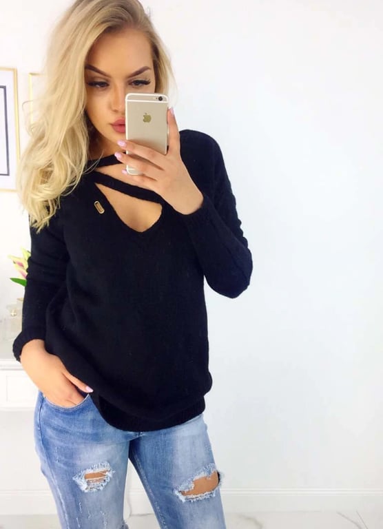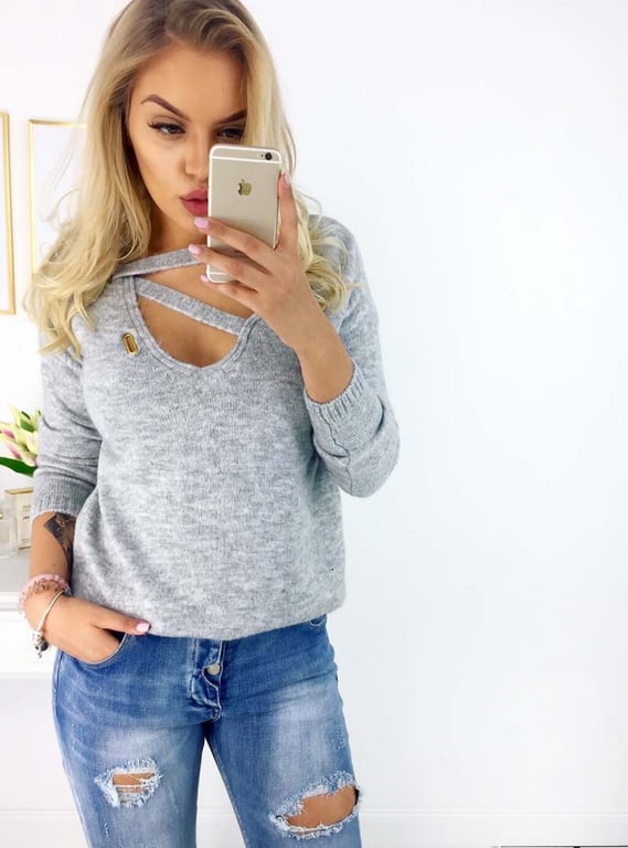 Elegant women's sweater featuring an original neckline. It is comfortable to wear. Ideal for the spring season.