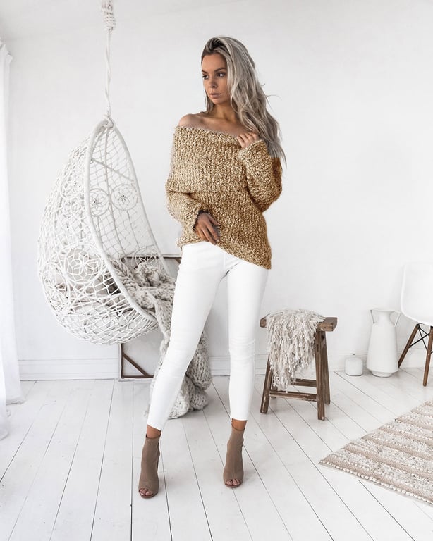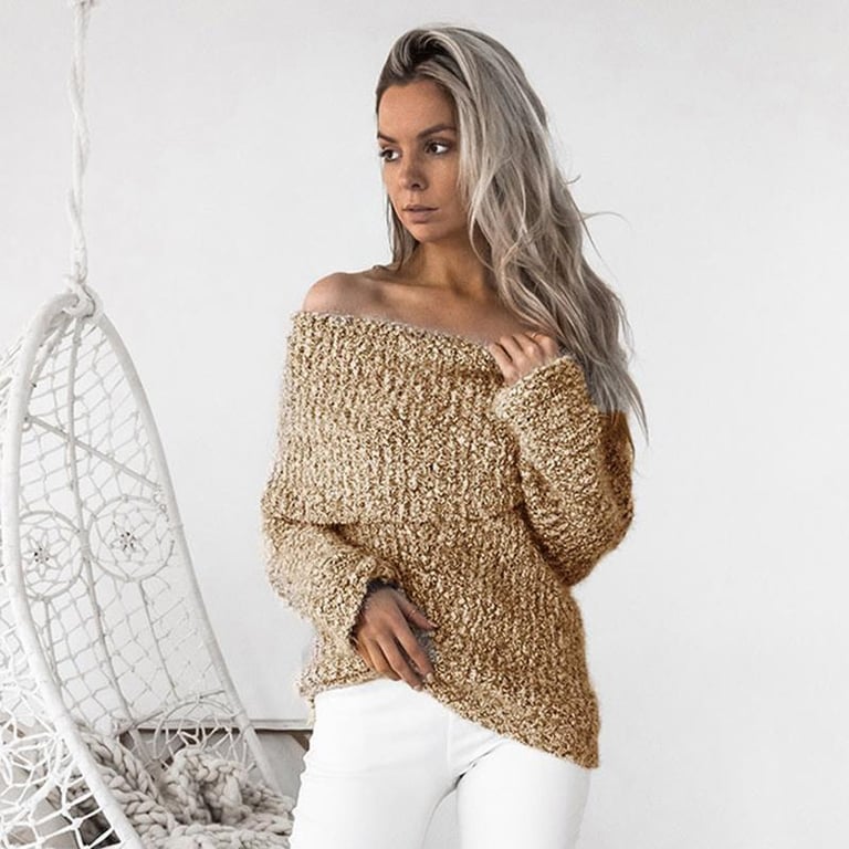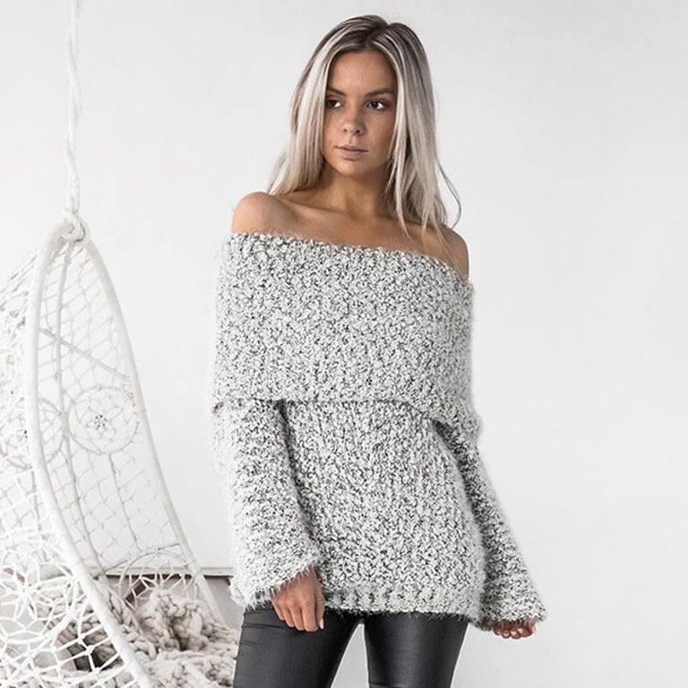 A beautiful elegant sweater featuring exposed shoulders and a very stylish cut. Available in two colours. Made from a soft, pleasant material.