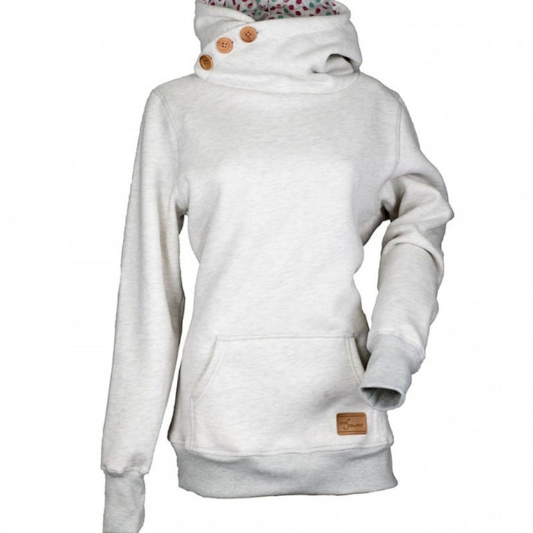 Women's hoodie with a hood and decorative buttons. The hoodie has a longer loose fit and a kangaroo pocket on the front. Available in multiple colour options.