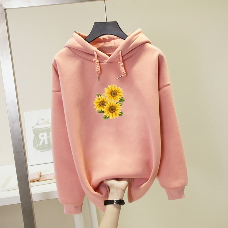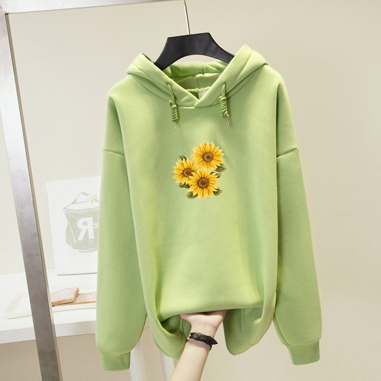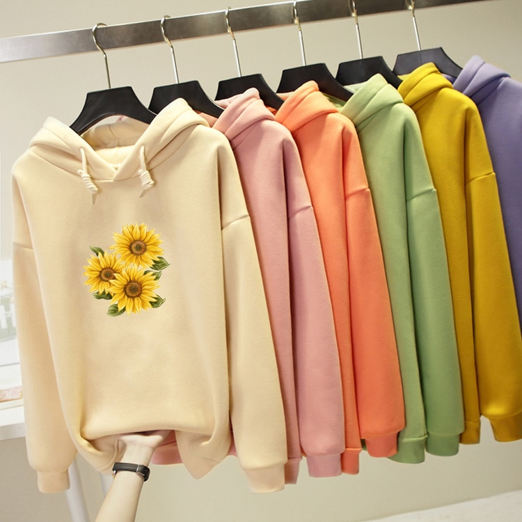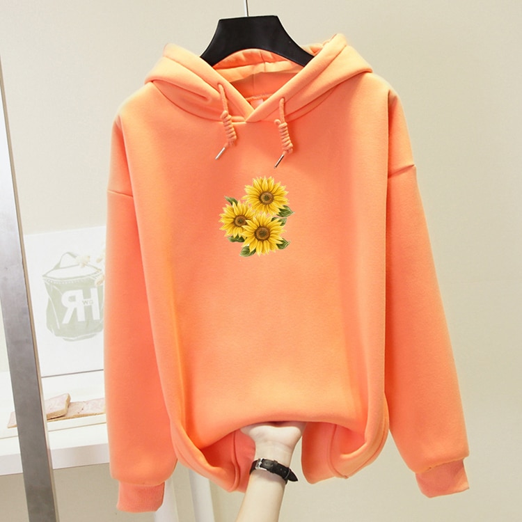 • Tags: Women's sweatshirt, hooded sweatshirt, with kangaroo pocket, comfortable, printed sweatshirt, sunflower print, flowers