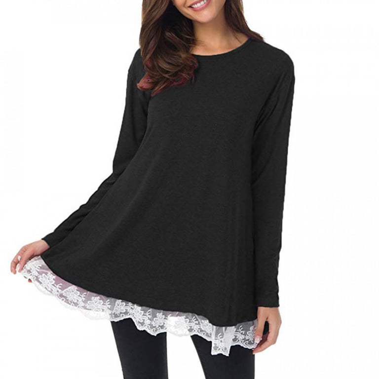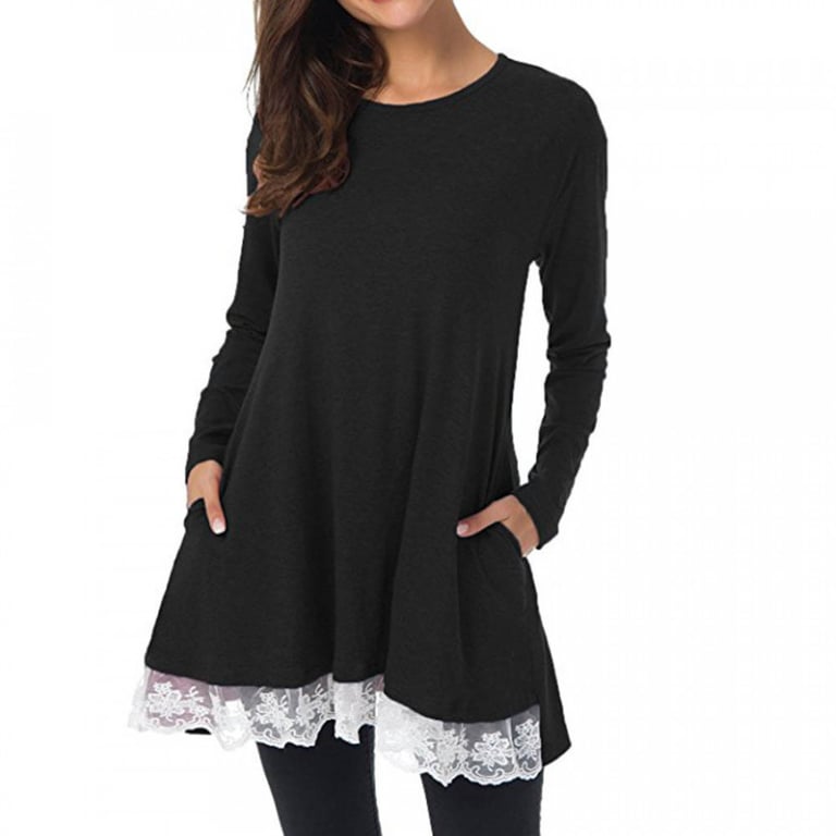 Women's long-sleeved t-shirt with pockets and a round neckline. The bottom of the t-shirt is trimmed with white lace. Available in two colour options.