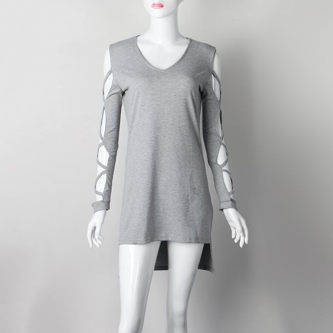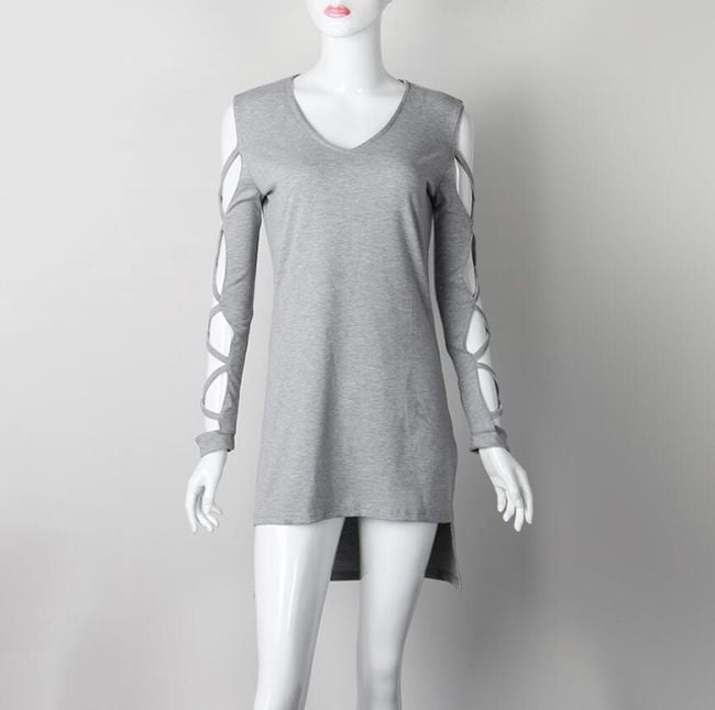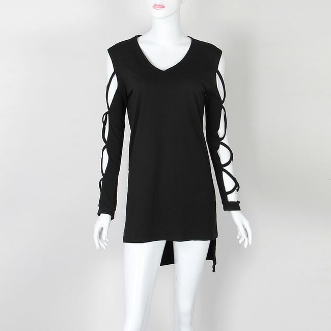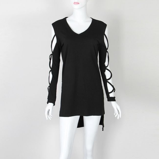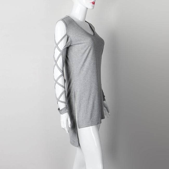 The long version women's t-shirt is adorned with laced sleeves. The measurements provided are for the product, not the body.
