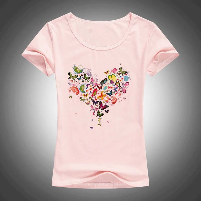 Stylish women's t-shirt with heart-shaped butterflies, perfect for spring and summer. The pleasant combination of colours will brighten up the entire outfit and you will look truly great. Get ready for the 2025 season.