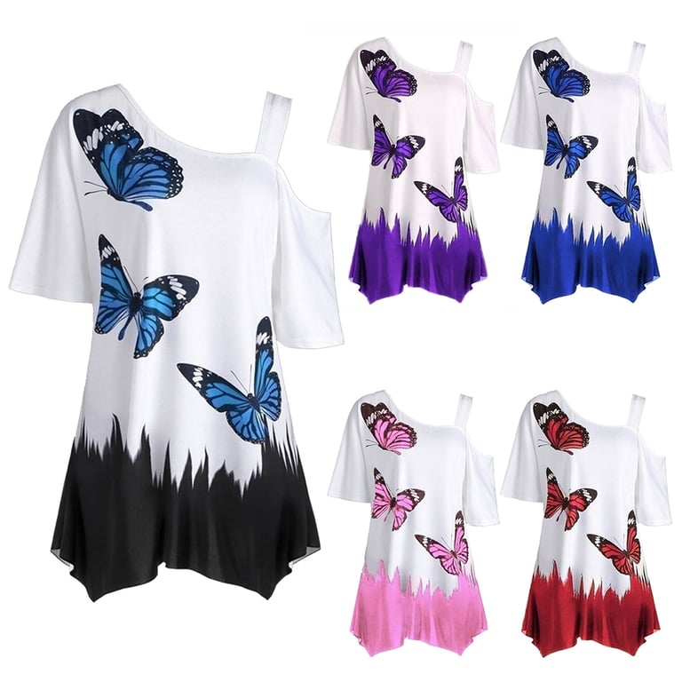 Women's T-shirt with Exposed Shoulder and Butterfly Print