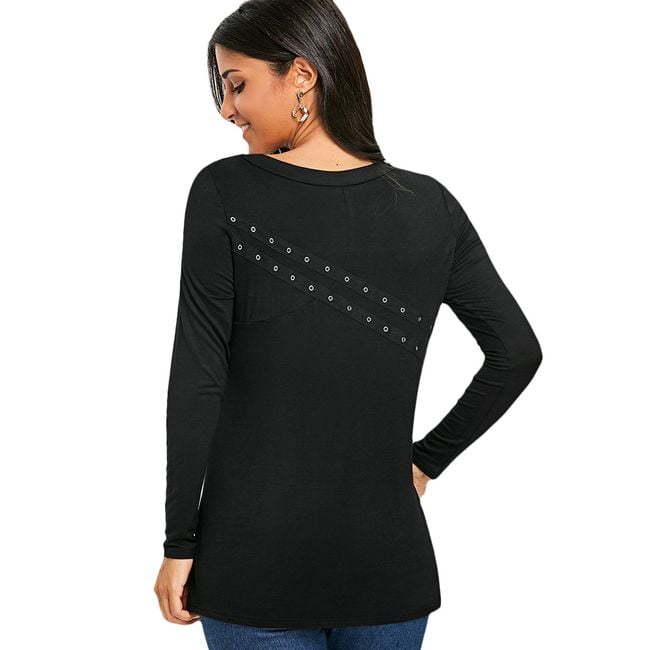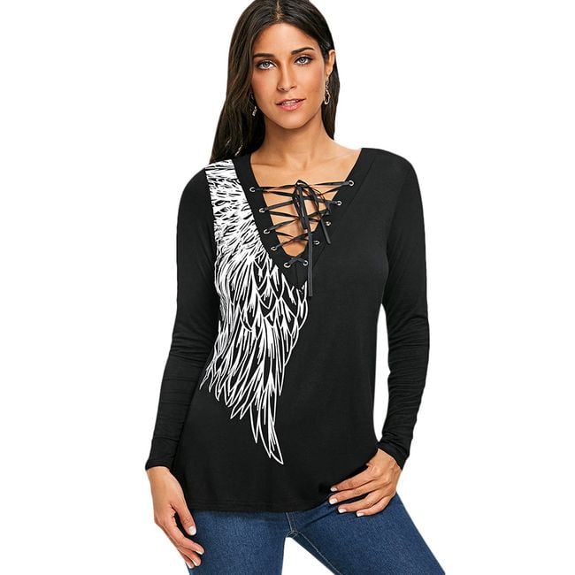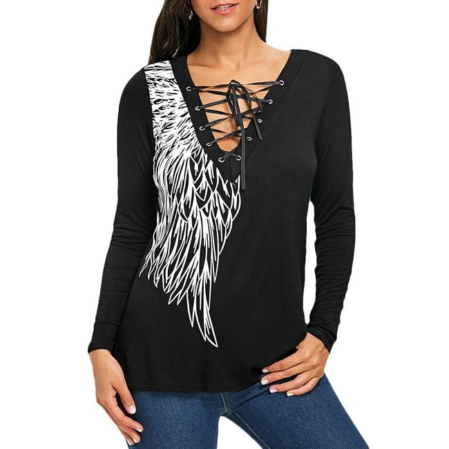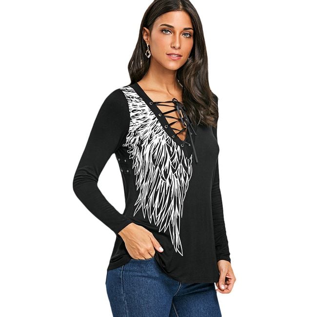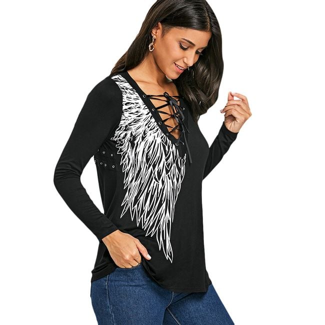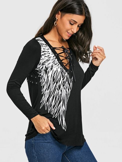 The t-shirt features sexy lacing at the neckline and is made from a comfortable material.