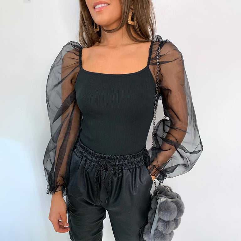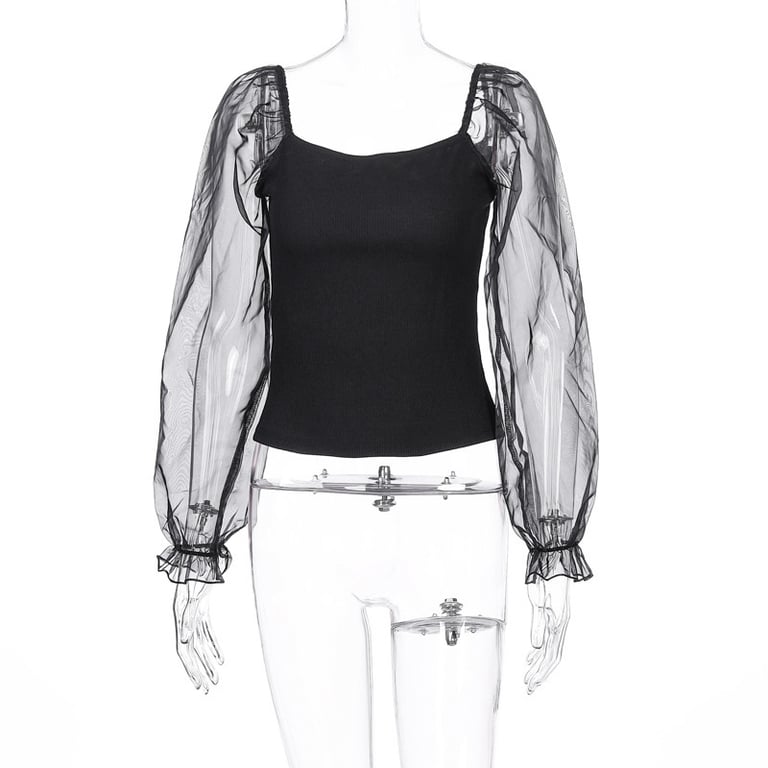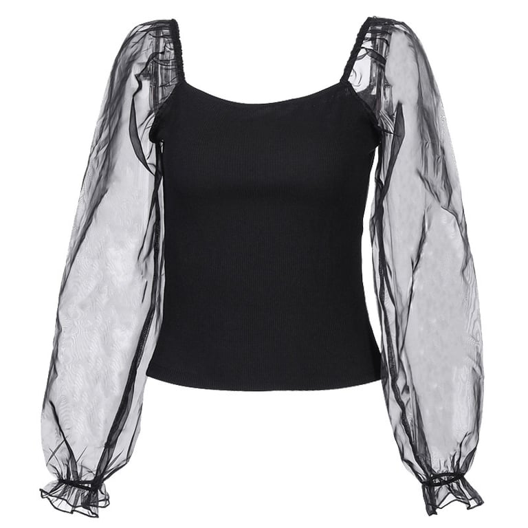 Women's T-shirt with Long Sheer Tulle Ruffled Sleeves