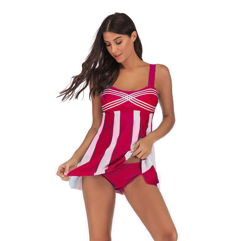 Women's tankini style swimwear. Two-piece with a tank top and wide straps, and a bottom part with a subtle cut. Plus size available. Available in several variations.