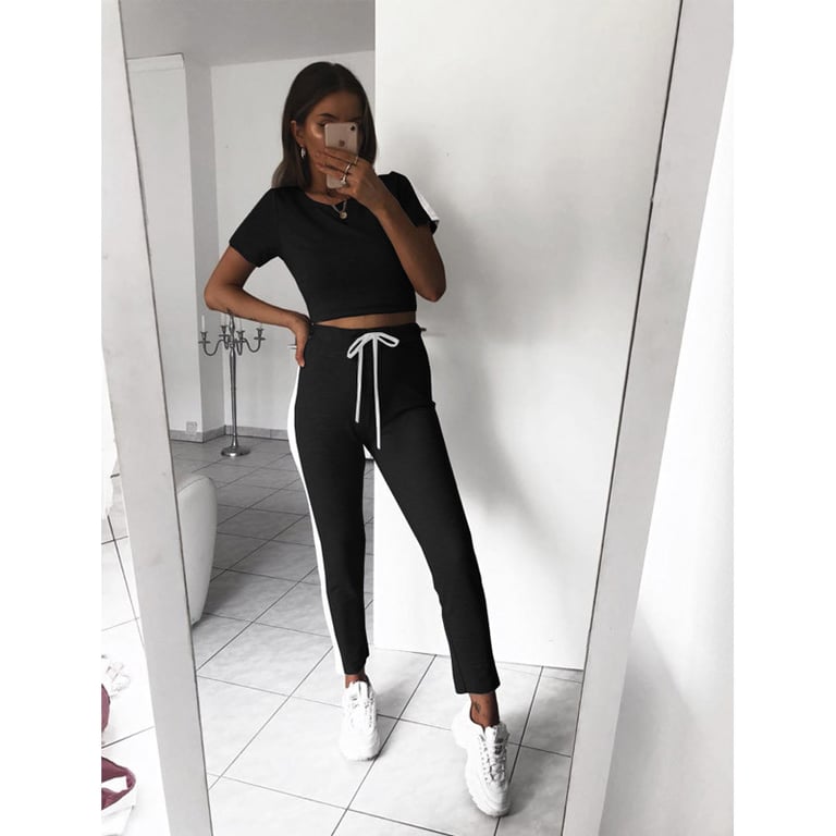 Women's tracksuit in a simple stylish design with a stripe on the side. Short crop top with short sleeves and a round neckline. Joggers with an elastic waistband. Available in several colours.