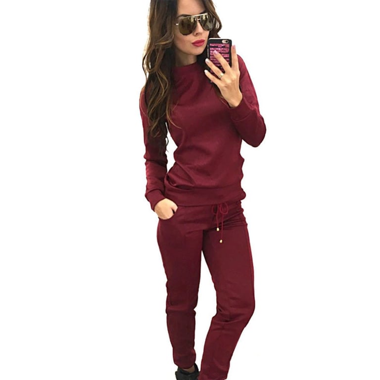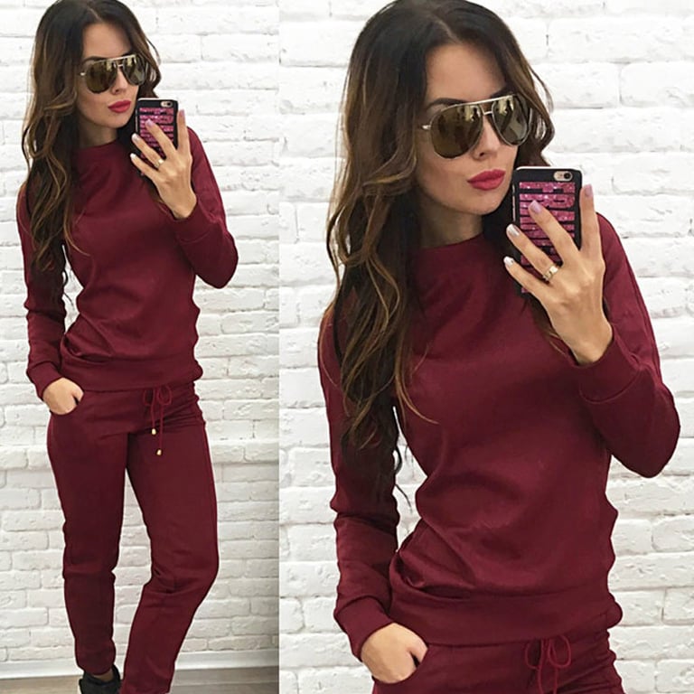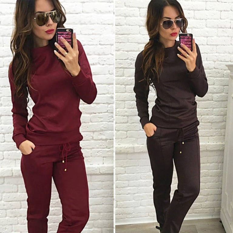 Women's tracksuit set consisting of a hoodie and trousers. The hoodie has a round neckline and the trousers have an elastic waistband. Simple, comfortable cut. The set is available in two colours.