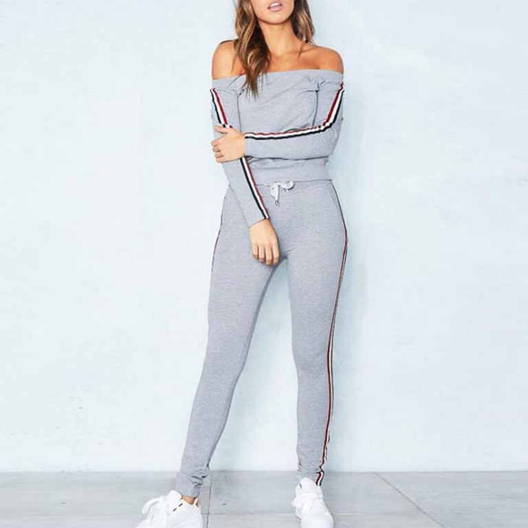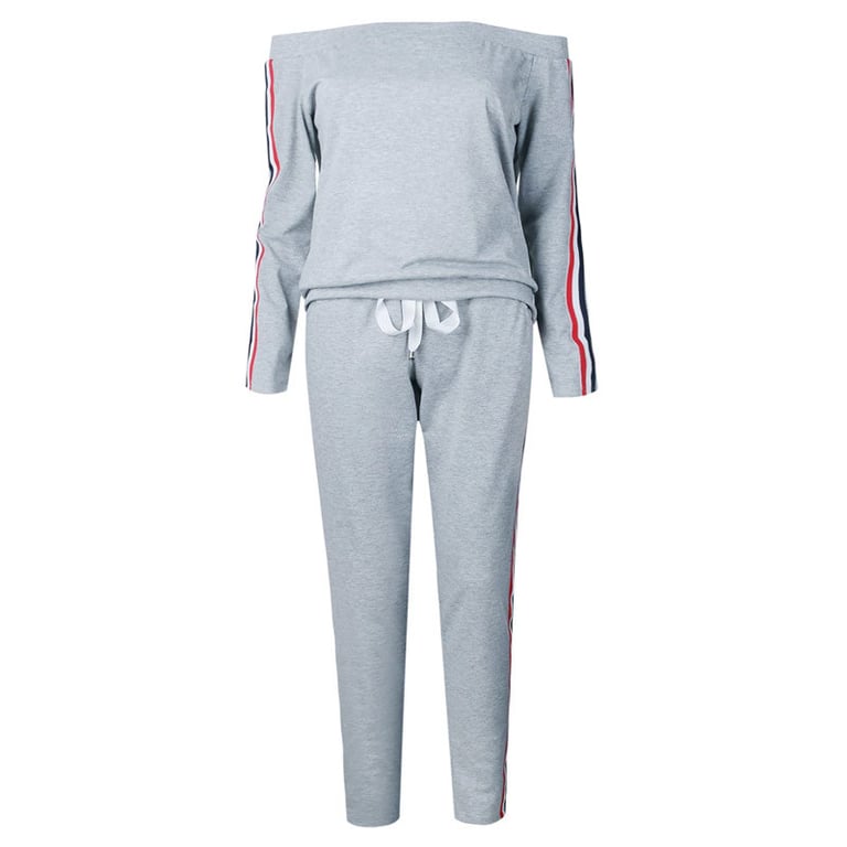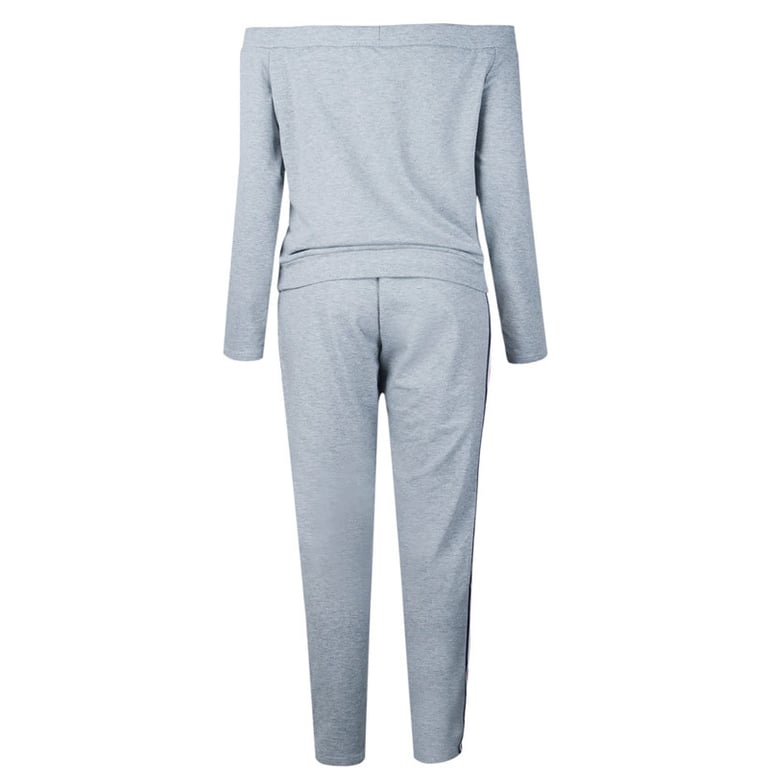 Women's tracksuit in a solid colour design with a stripe on the side. Sweatshirt with an off-the-shoulder neckline. Trousers with slim legs and an elastic waistband. Available in two colour options.