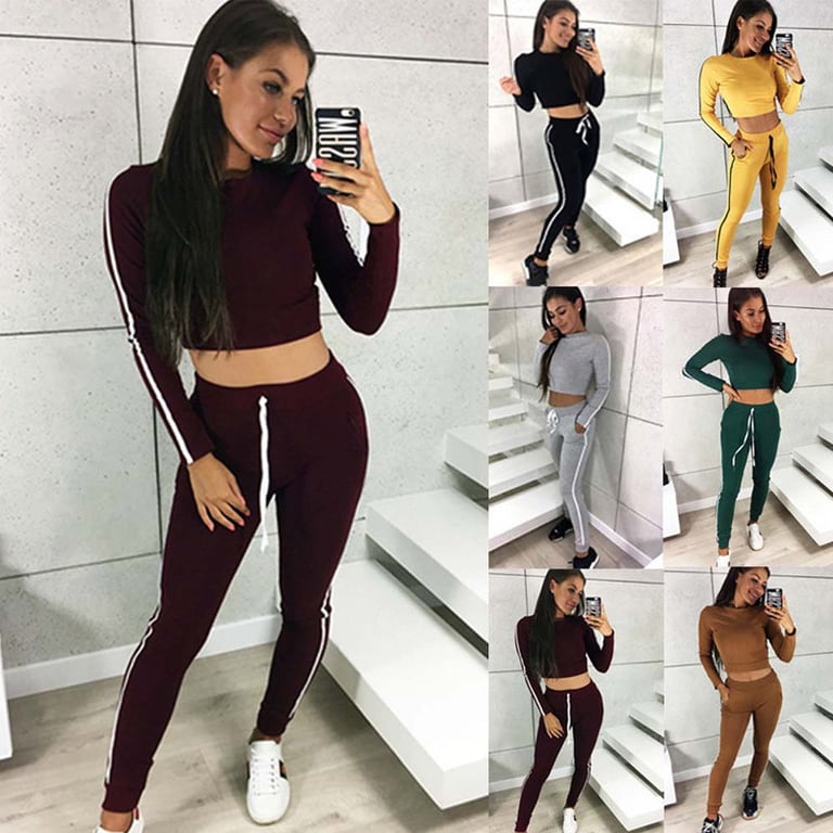 Women's tracksuit in a stylish solid colour design with a stripe. Short crop sweatshirt with long sleeves and a round neckline. Trousers with slim legs and an elastic waistband. Two side pockets. Available in several colour options.