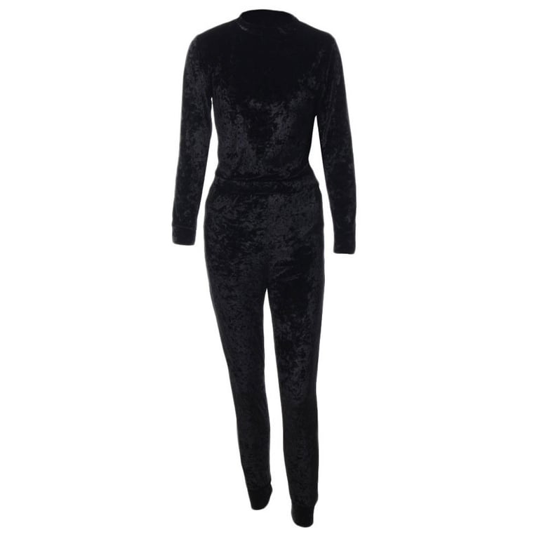 Women's tracksuit set consisting of a hoodie and trousers in a velvet finish. The hoodie features a round neckline. The trousers have an elastic waistband. Available in several colour options.