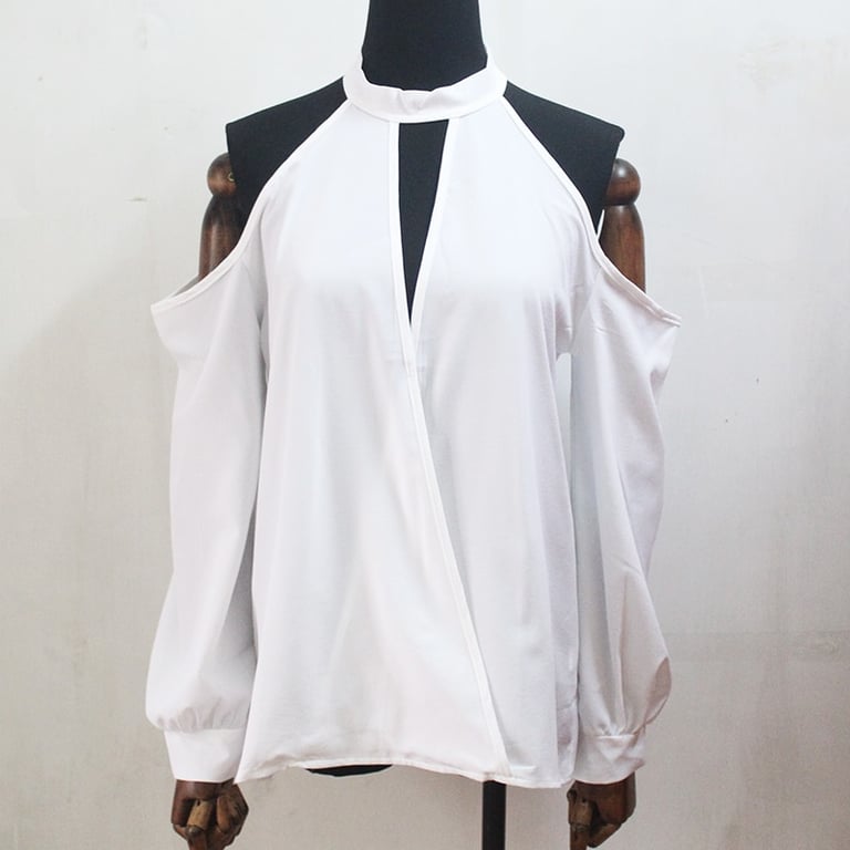 Exposed shoulders, light neckline, and long loose sleeves.