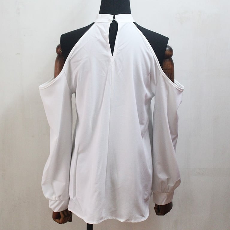 Exposed shoulders, light neckline, and long loose sleeves.