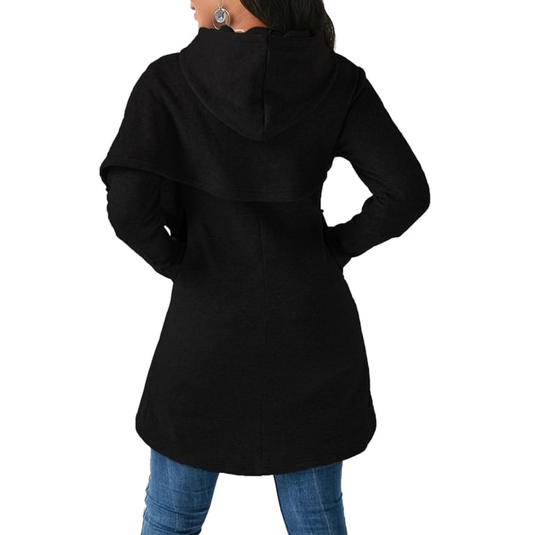 Longer cut that covers the bottom, with a hood and pocket, and long sleeves.