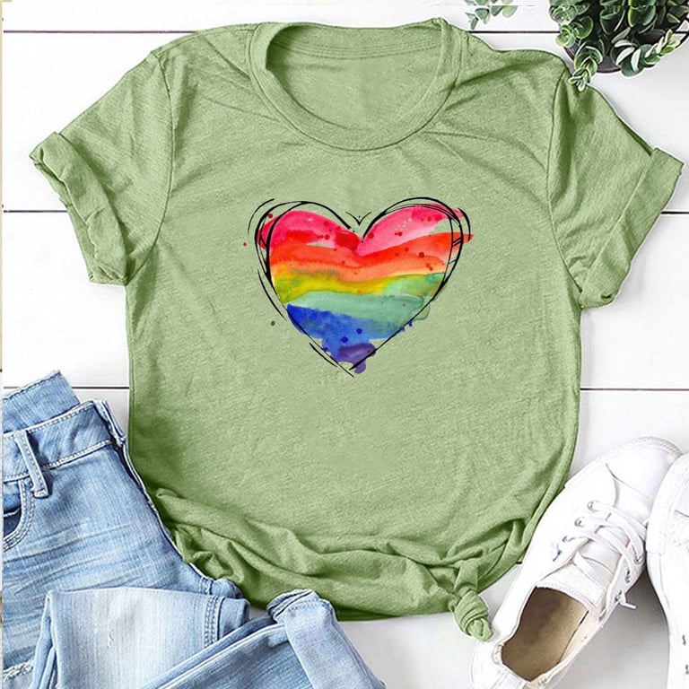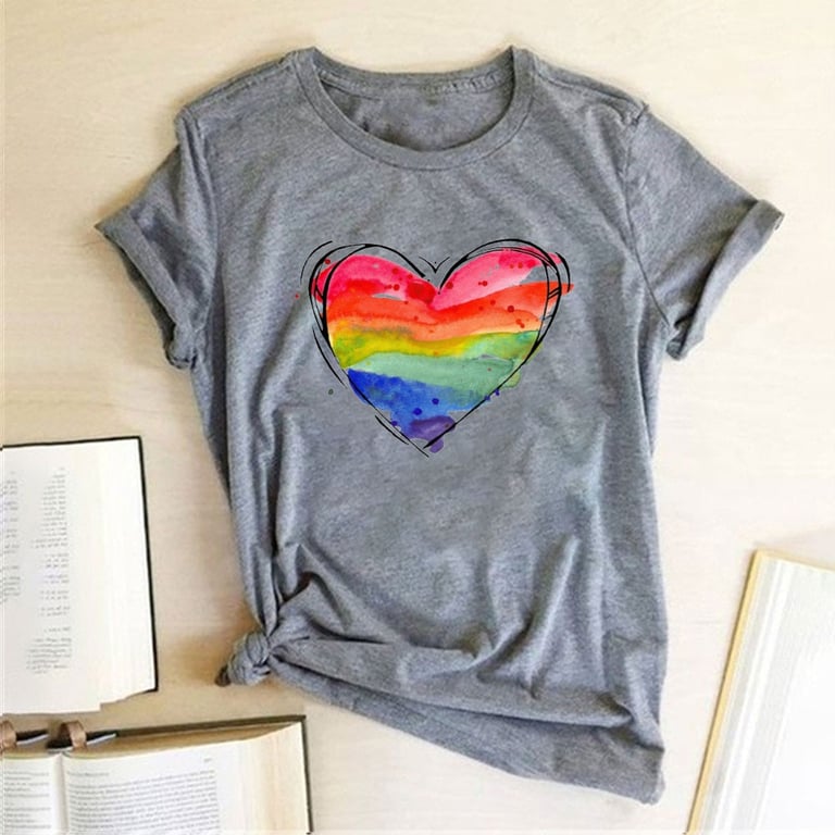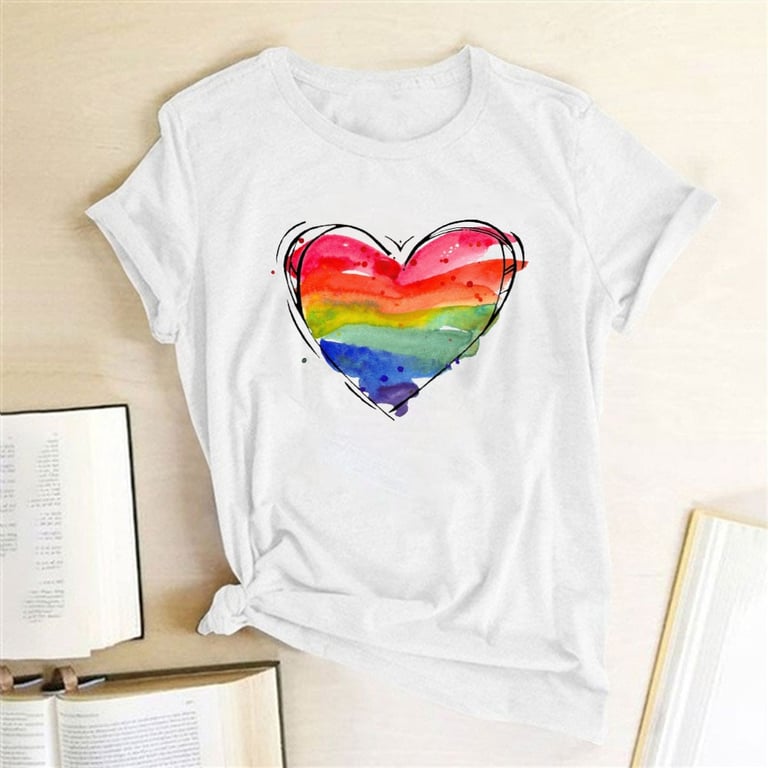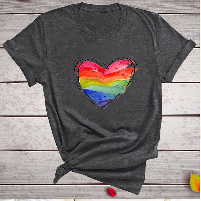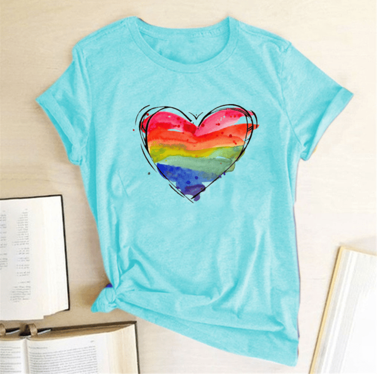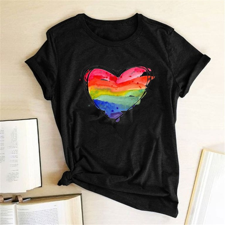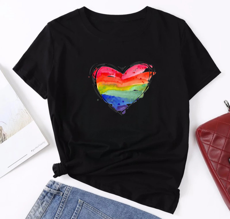 The t-shirt features a print on the front showing a heart in rainbow colours.