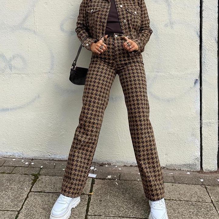 Beautiful women's fabric trousers made of polyester and spandex. The trousers feature a fashionable pattern.