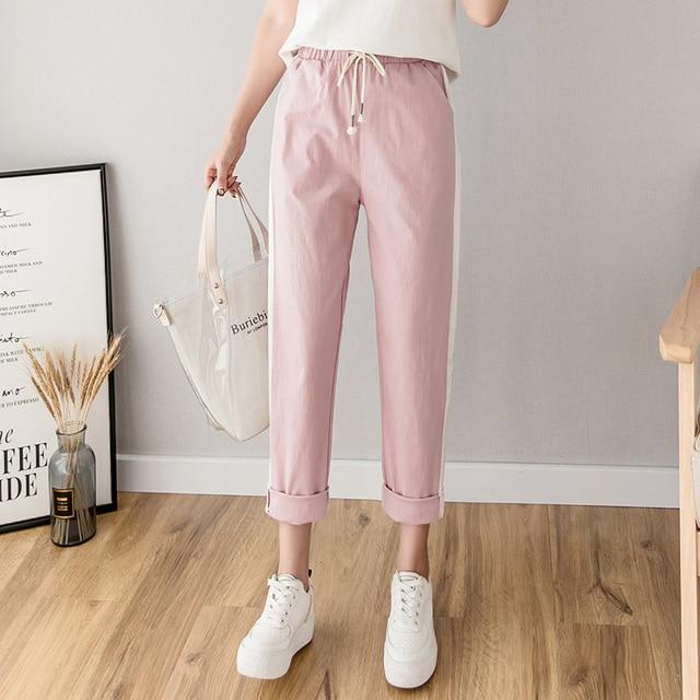 Lightweight cotton trousers with a drawstring waist. Decorative stripes on the sides.