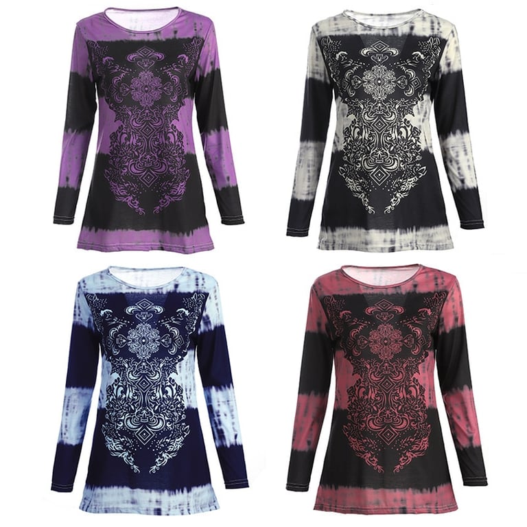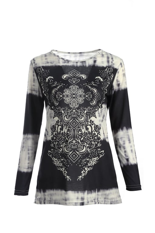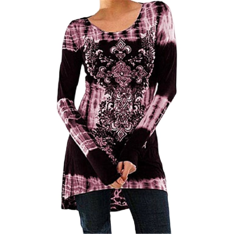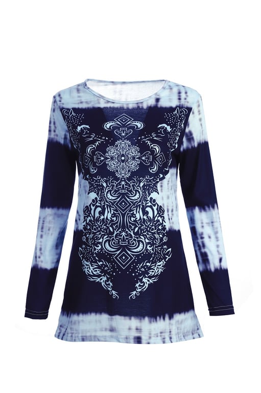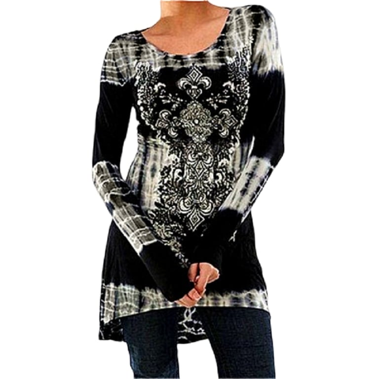 • The women's tunic has a loose fit, long sleeves, and a bohemian pattern.